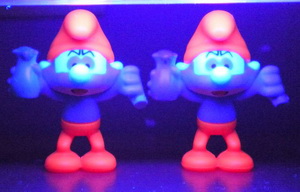 UV-Variante: links= Schlumpf Schwänzchen nicht leuchtend rechts= Schlumpf Schwänzchen leuchtend Dank an Ronny Lubatsch für Info und Bild! |
