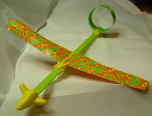 Segelflieger mit Papier- statt Plastikflügel. Abweichende Flügelbefestigung.