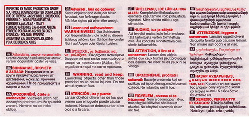 Großer Zusatzzettel mit Nummer 60550287. Text "Das Schleudern von Gegenständen, die nicht zu diesem Spielzeug gehören, kann Schäden hervorrufen. Nicht auf Augen oder Gesicht zielen." |