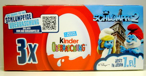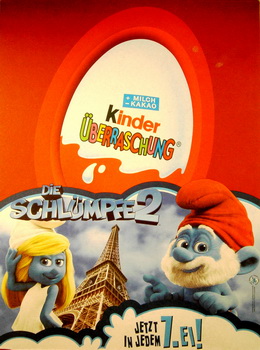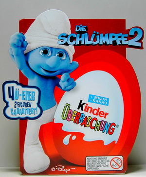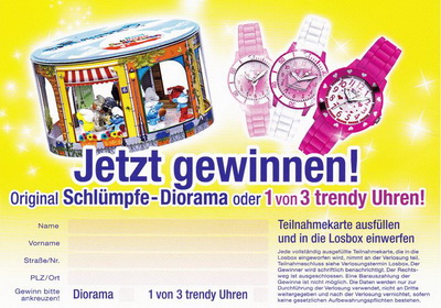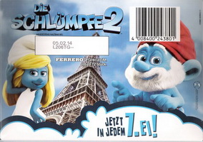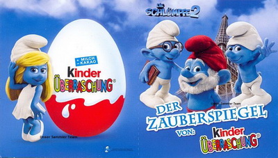 | In größeren Verbrauchermärkten gibt es eine neue Aktion von Ferrero! Der Zauberspiegel von Ferrero ist eine Karte die sich in der Mitte falten lässt, bei der Aktion wird ein Foto gemacht das innen eingeschoben wird. Auf der Karte der Schlümpfe sind vier Figuren abgebildet, die Rückseite zeigt das Innenleben, über dem Feld "wurde verschlumpft" wird dann der Name eingetragen. Daneben wird das passende Foto eingeschoben das direkt im Markt ausgedruckt wird. Eine sehr gelungene Promoaktion von Ferrero. Unbeschriftet und ungeknickt dürften diese Karten seltener sein. |