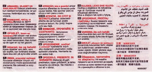 Großer Zusatzzettel mit Nummer 60550287. Text "Das Schleudern von Gegenständen, die nicht zu diesem Spielzeug gehören, kann Schäden hervorrufen. Nicht auf Augen oder Gesicht zielen." |
